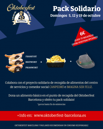 Si es así, te esperamos los domingos 5, 12 y 19 de Octubre, todo el día, con un alimento básico bajo el brazo para colaborar con el Centro de Servicios y Comedor Social Canpedró, y con Imagina ser feliz, y podrás acogerte al Pack Solidario de Oktoberfest Barcelona 2025.